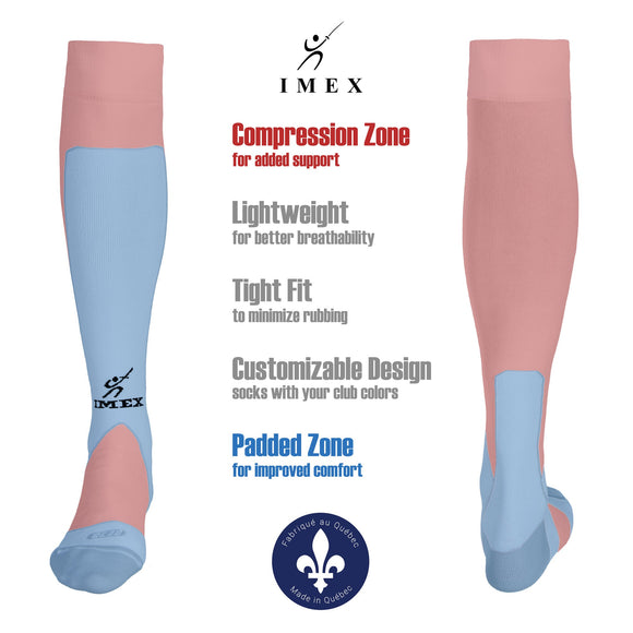 Ces chaussettes sont spécialement conçues pour l'escrime et sont fabriquées à Montréal. Elles sont composées de 95 % de nylon et de 5 % de spandex, ce qui les rend très extensibles. Les zones couvrant la voûte plantaire et le mollet sont plus fines et plus serrées afin de mieux soutenir, tandis que le reste de la chaussette est plus épais pour offrir un meilleur confort et un meilleur amorti.